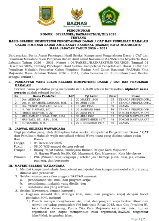 Mojokerto | Kota  2 Desember 2025 – Setelah melalui proses seleksi yang ketat, Badan Amil Zakat Nasional (BAZNAS) Kota Mojokerto mengumumkan delapan nama yang berhasil lolos dari tahap Kompetensi Dasar (CAT) dan Penulisan Makalah. Mereka akan melanjutkan perjuangan untuk menjadi pimpinan BAZNAS Kota Mojokerto periode 2026-2031.