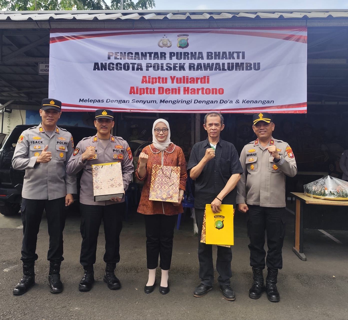 Kegiatan yang dimulai sekitar pukul 08.30 WIB tersebut berlangsung dengan khidmat dan penuh nuansa kebersamaan. Dalam kesempatan tersebut, Polsek Rawa Lumbu melepas dua personel yang telah memasuki masa purna bhakti, yaitu Aiptu (Purn.) Deni Hartono dan Aiptu (Purn.) Yuliardi, yang telah menuntaskan pengabdian panjangnya di institusi Kepolisian Negara Republik Indonesia.